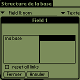 Dans la liste de gauche, apparaissent toutes les bases que sait ouvrir Pilot-DB. Quand vous sélectionnez une base, les nom des champs de fiche de cette base apparaissent dans la liste de gauche.